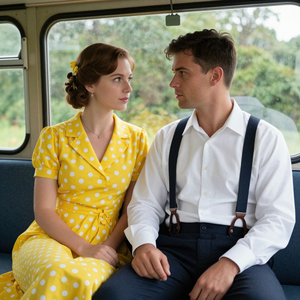 Couple seated in a vintage-style bus interior, dressed in period attire, with the woman wearing a vibrant yellow polka-dot dress and the man in a crisp white shirt with dark suspenders, both gazing intently at each other against a backdrop of lush greenery visible through the windows.