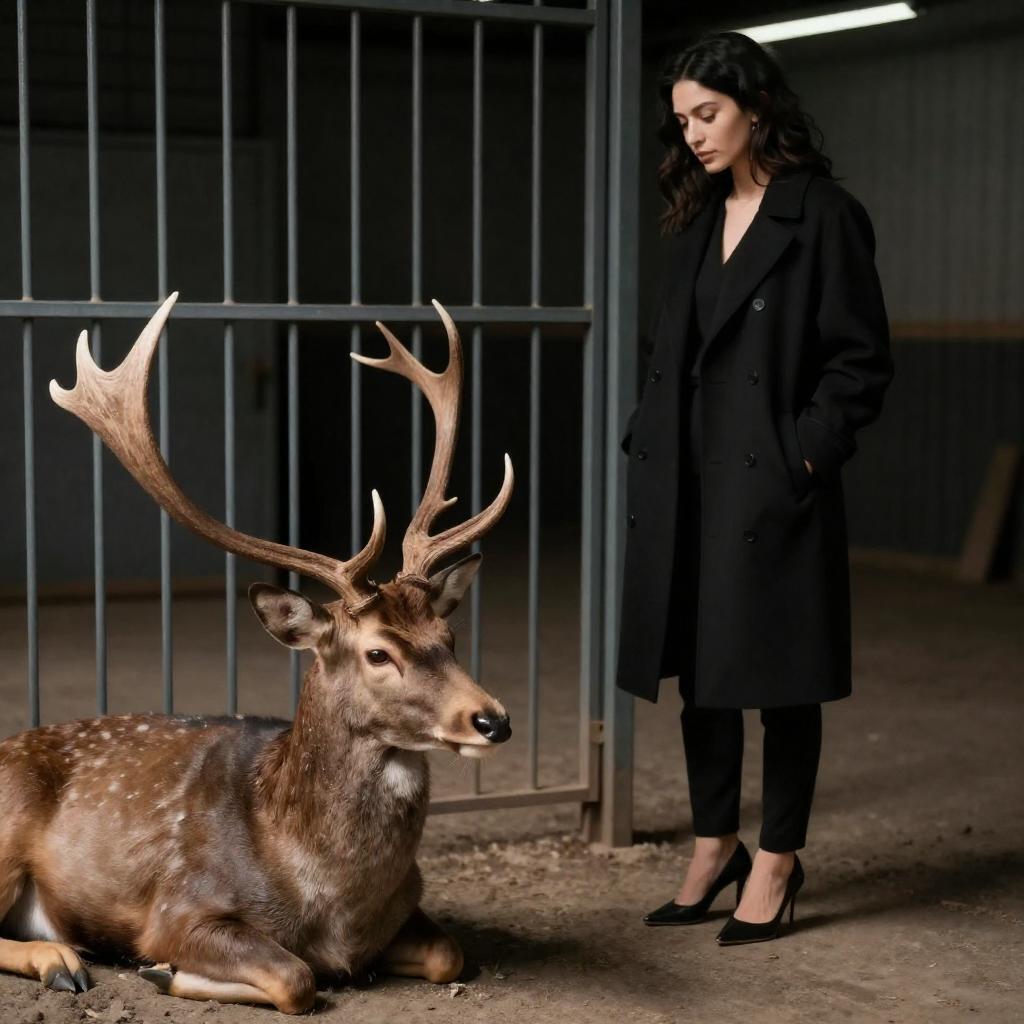 Photograph of a woman in a black coat and heels standing beside a metal cage, looking down at a large, brown deer with impressive antlers lying on the concrete floor. The cage has vertical bars, and the background includes dark, industrial walls. The woman's dark hair is slightly wavy, and she stands with her hands in her coat pockets.