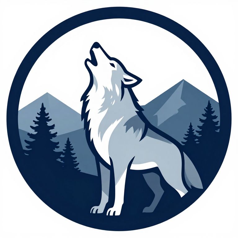 Stylized logo featuring a wolf howling at the moon with a backdrop of mountains and pine trees. The design is circular with shades of blue and white creating a bold and minimalistic nature-themed emblem.