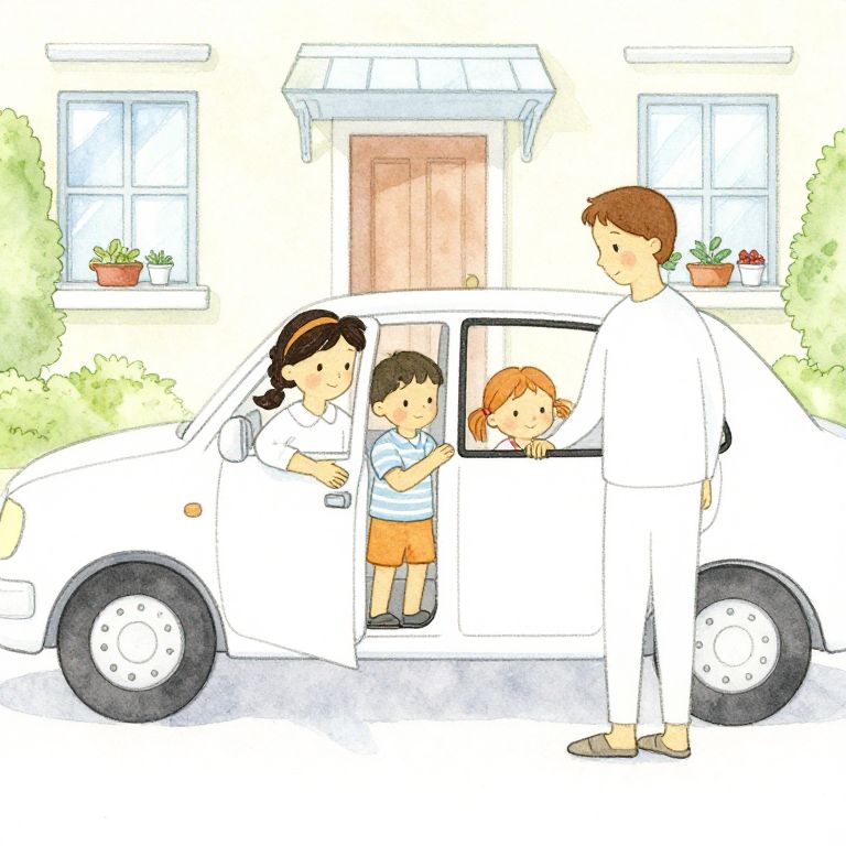 Illustration of a family with two children, a mother, and a father standing beside a white car in front of a house.