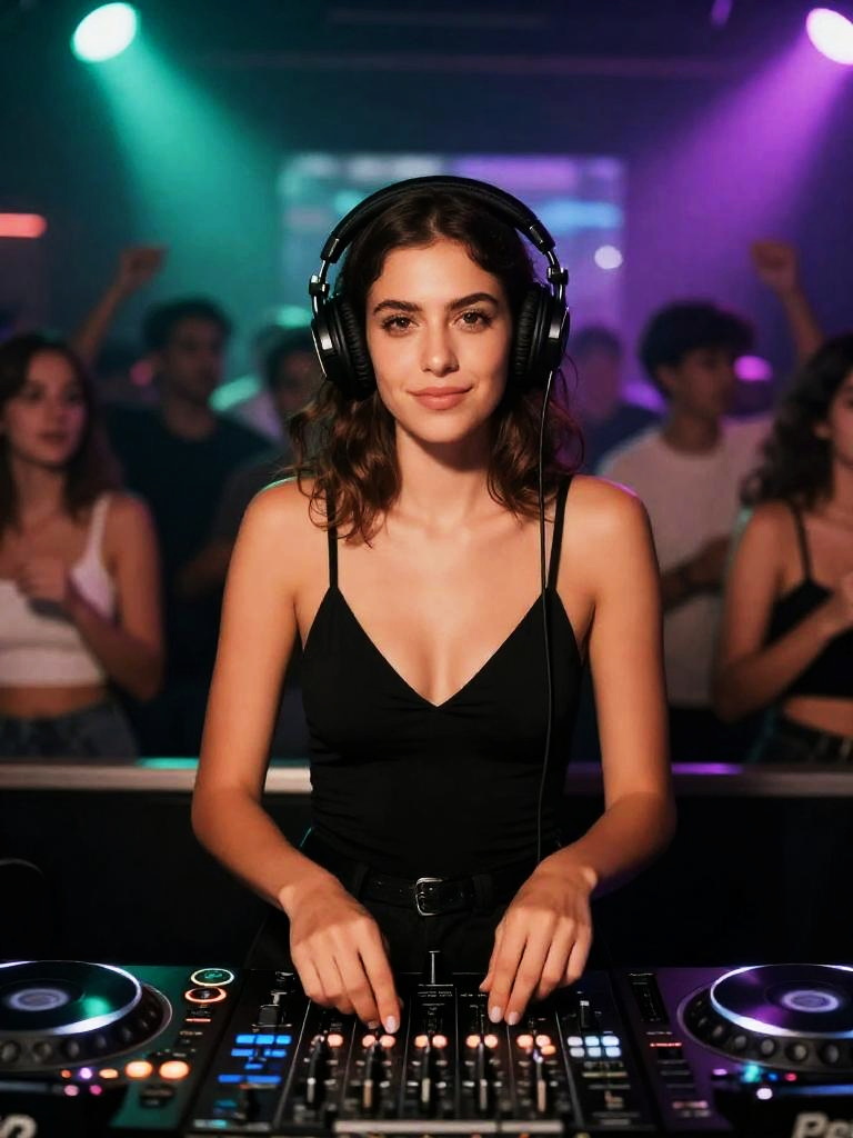 Woman dj in a club, confident female DJ centered behind the decks, both hands resting on the mixer, facing camera directly, olive-skinned woman with shoulder-length wavy brown hair and slight smile wearing black v-neck bodysuit, large over-ear headphones on her head, energetic crowd softly blurred in the background, turquoise and purple beams club lights glowing behind the people, sharp foreground with bokeh lights, high-energy concert vibe, ultra-detailed