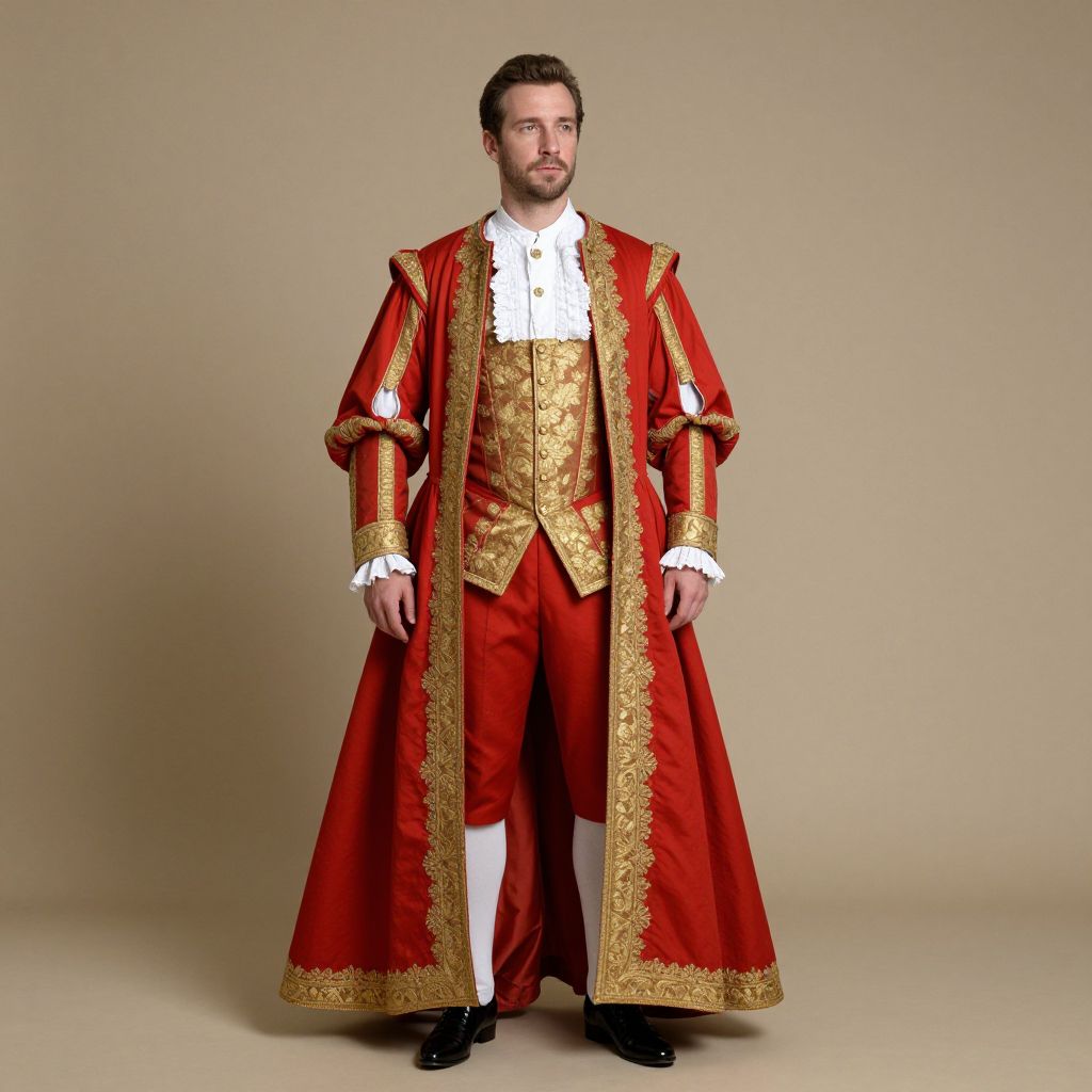 French king dress, man in a red and gold suit and white collared shirt