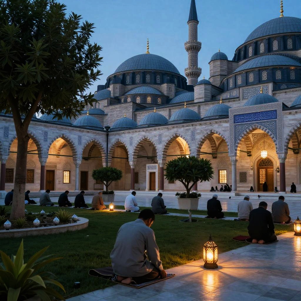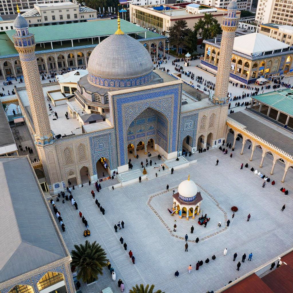 What is the Islamic place of worship shown through an aerial view of a magnificent mosque complex, expansive prayer halls, geometric tile work, crowds of diverse worshippers during a festive occasion.