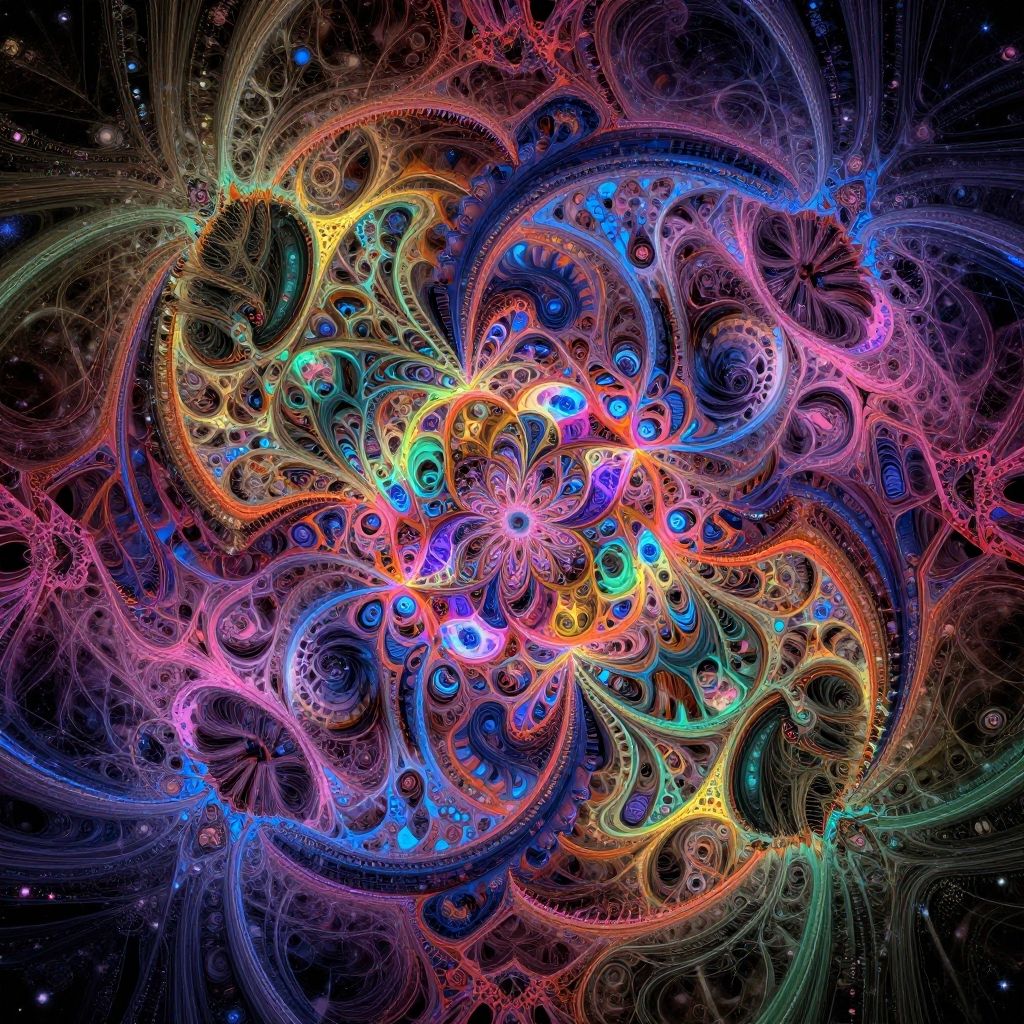 Fractalism art, intricate geometric patterns unfolding infinitely, vibrant colors blending seamlessly, digital surrealism style, high detail, cosmic background