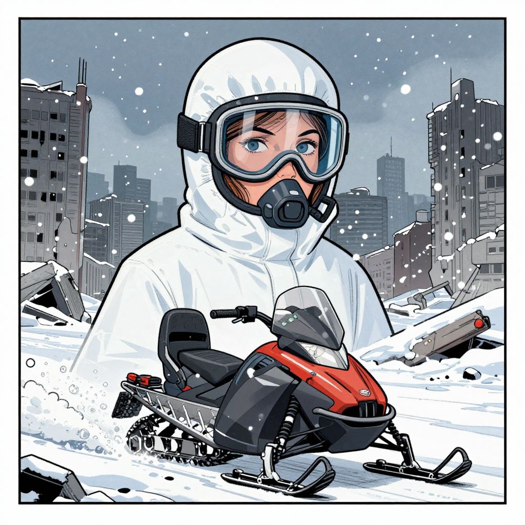 Digital comic-style drawing of a young person in a white snowsuit, gas mask, and goggles, holding a red and black snow blower amidst a