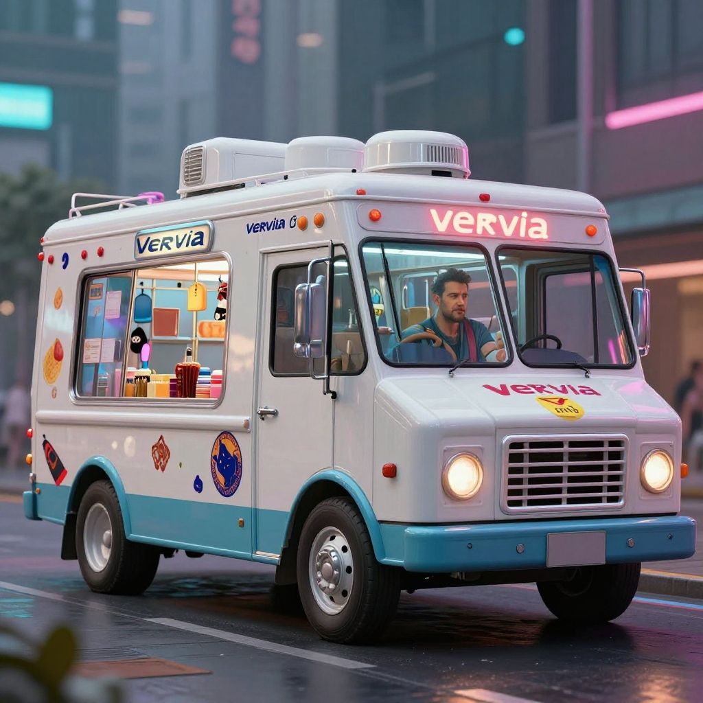 Photograph of a vibrant, white and blue ice cream truck with neon "Verdia" sign, colorful decals, driving on a rainy urban street,