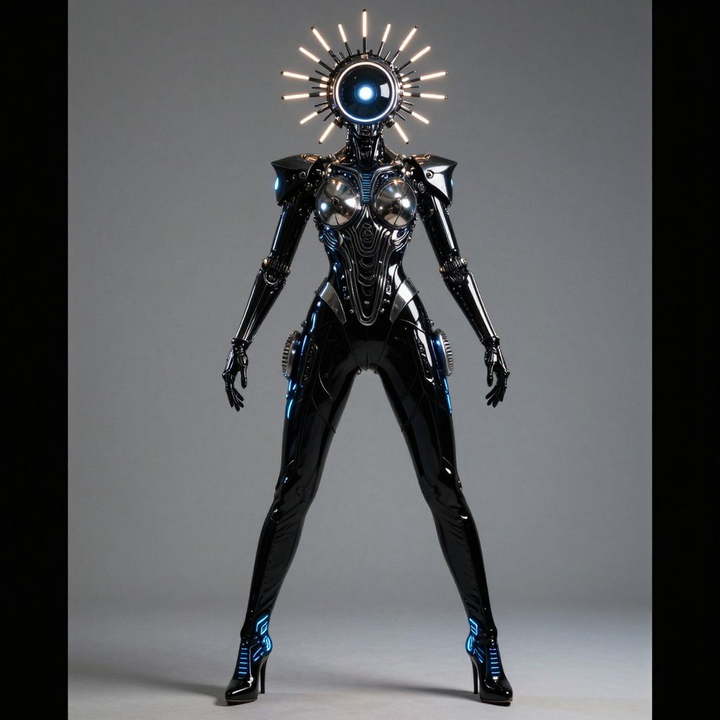 FULL BODY, ACTION POSE, DYNAMIC INSTANCE Image showcases a FULL BODY OF A futuristic, avant-garde costume with a high-tech, sci-fi aesthetic, The subject is a humanoid figure adorned in a glossy, black, and metallic outfit that appears to be made of synthetic materials, The headpiece is particularly striking, featuring a large, circular, black visor with a bright, central light, surrounded by numerous thin, illuminated rods extending outward, resembling a halo or crown, The torso and shoulders are covered in intricate, reflective patterns and textures, including small, HIGH HEELS BOOTS GLOWING IN BLUE NEON, glowing elements and what appear to be circuit-like designs, The overall design is highly detailed, with a focus on a sleek, robotic appearance, blending elements of fashion and technology seamlessly, FULL BODY hyperdetailed photography, extreme detail, outstanding composition:1, 4, HDR, photography, analog film, real life, extremely beautiful, ray tracing, dramatic, professional photo 85mm lens for elegant body lines and fine skin detail with sharp subject