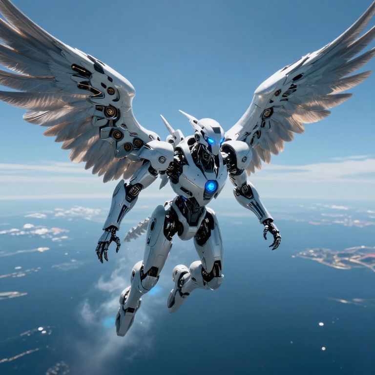 A futuristic, mechanical angel with glowing blue eyes and wings, soaring through a sci-fi ocean planet's atmosphere.