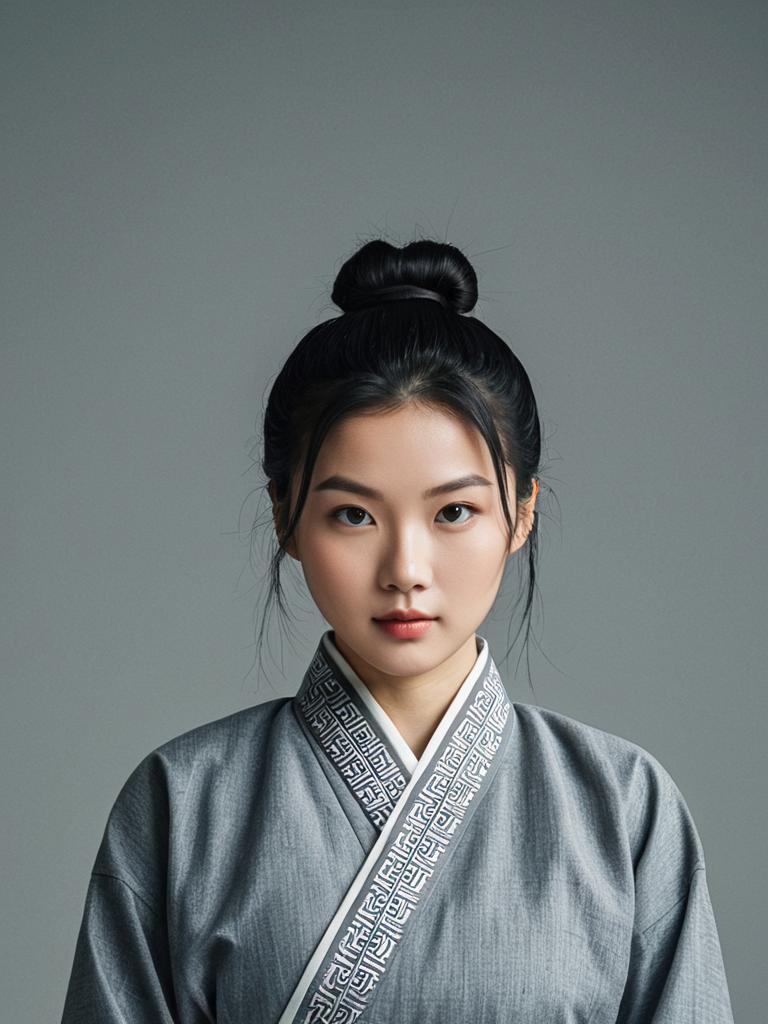 Korean tops costume, solo, 1girl, black hair, korean clothes, looking at viewer, grey background, hair bun, closed mouth, standing, simple background, long sleeves, realistic, single hair bun