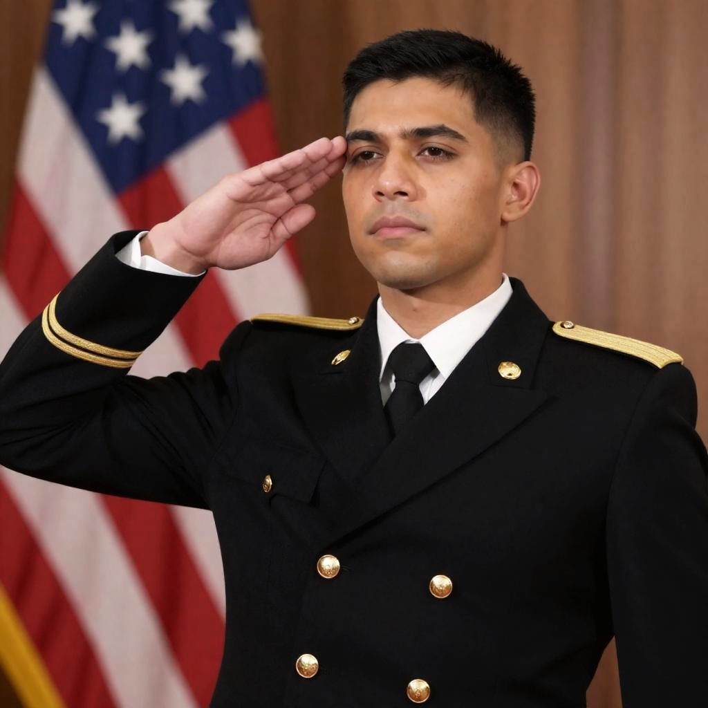 Photograph of a young man with dark hair, wearing a black double-breasted military-style uniform with gold buttons and a black tie. He salutes with his right hand, eyes slightly squinted. Blurred background with an American flag and wooden elements.