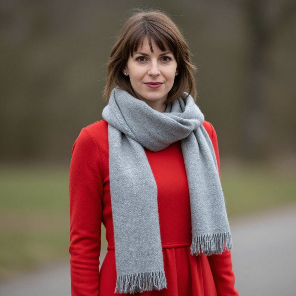 "Ursula Woman, woman in a red dress and a gray scarf"