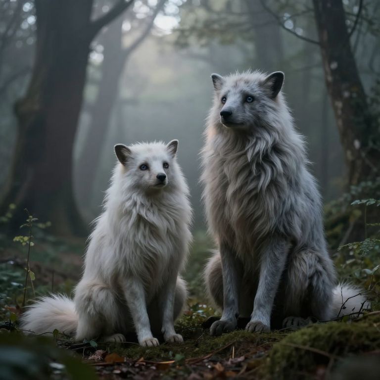 In a misty forest where echoes of forgotten dreams linger, two ethereal beings sit and stand, their fur soft as whispers, their gaze piercing like the first light of dawn, embodying the quiet tension between solitude and connection amidst the timeless embrace of nature.