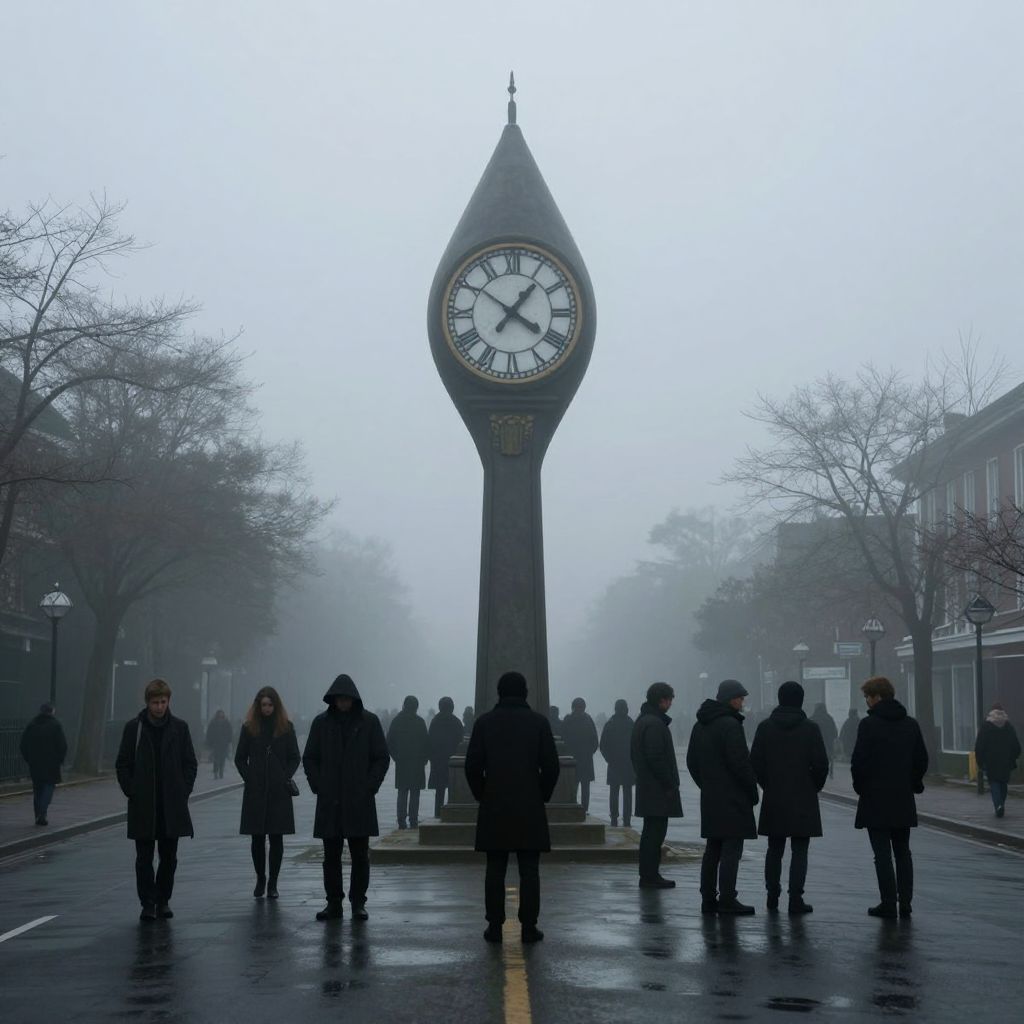 A surreal teardrop-shaped clock tower stands solemnly amidst a foggy avenue, its face etched with Roman numerals, while shadowy figures in dark coats gather below, their reflections merging with the misty ground as if caught in a timeless, melancholic trance.
