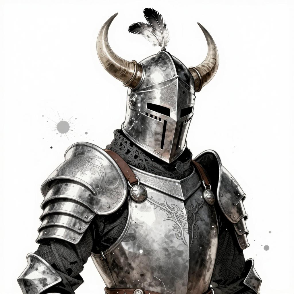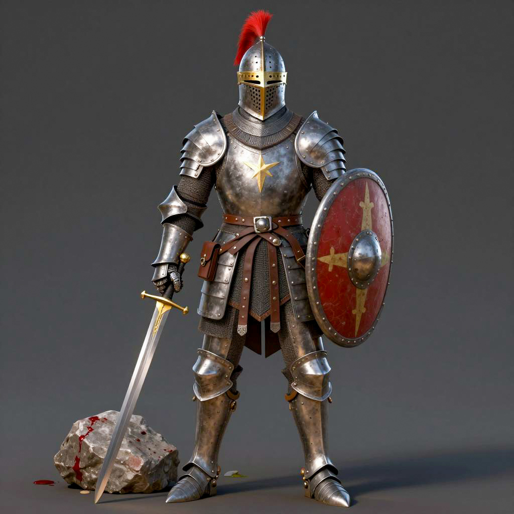 Medieval knight in detailed, worn, silver armor with fur trim, holding a large sword in right hand and a round shield in left. Red plume on helmet. Standing on rocky ground with bloodstains. Dark background. Full body, front-facing. Realistic, digital illustration style.
