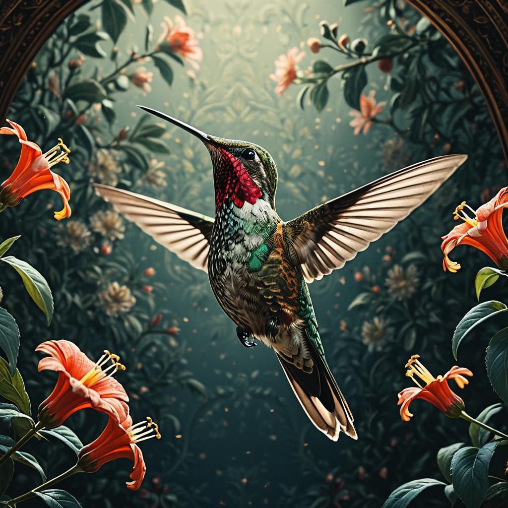 Kingfisher with intricate floral background, medium-angle shot with natural lighting, inspired by Yoshitaka Amano, Octane Render, fine art