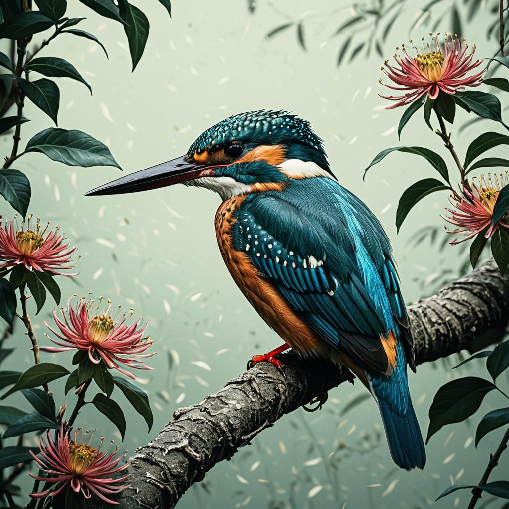 A vibrant kingfisher bird with bright blue and orange feathers perched on a textured tree branch. The background features delicate pink flowers and lush green leaves, creating an intricate natural setting. The image captures the fine details of the bird's plumage and the soft natural lighting enhances the fine art style inspired by Yoshitaka Amano.