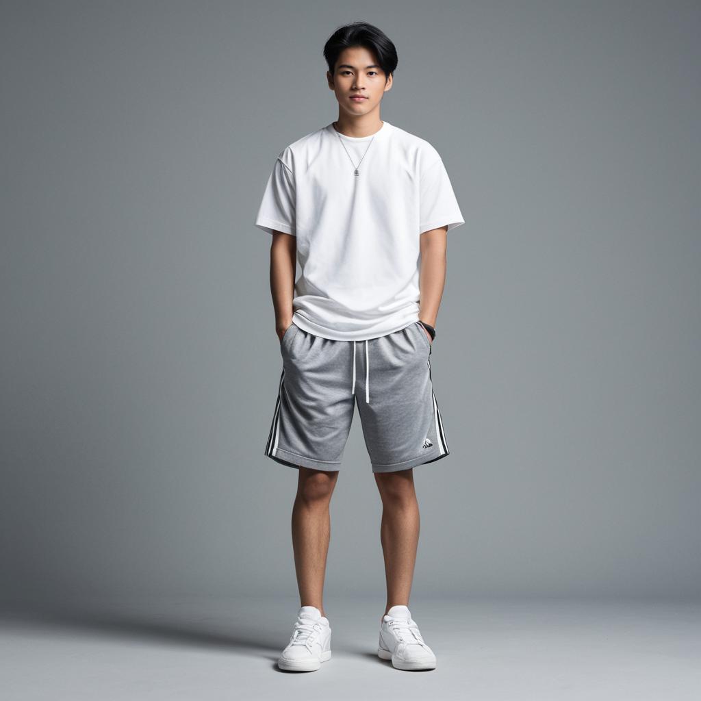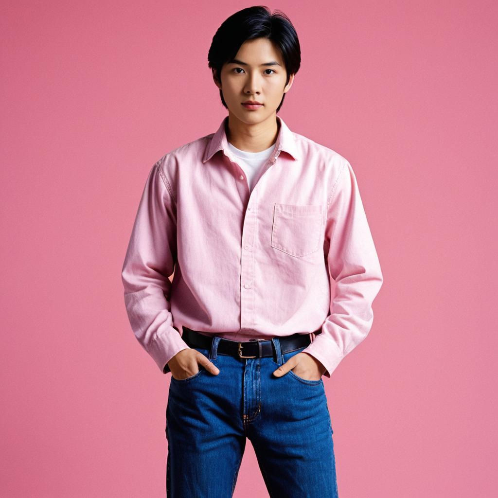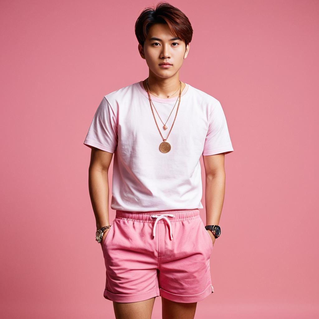 Pink shorts outfit man,1boy, male focus, solo, realistic, shorts, shirt, belt, pink shirt, hands in pockets, collared shirt, standing, asian, looking at viewer, pink shorts, black hair, brown hair, pink background