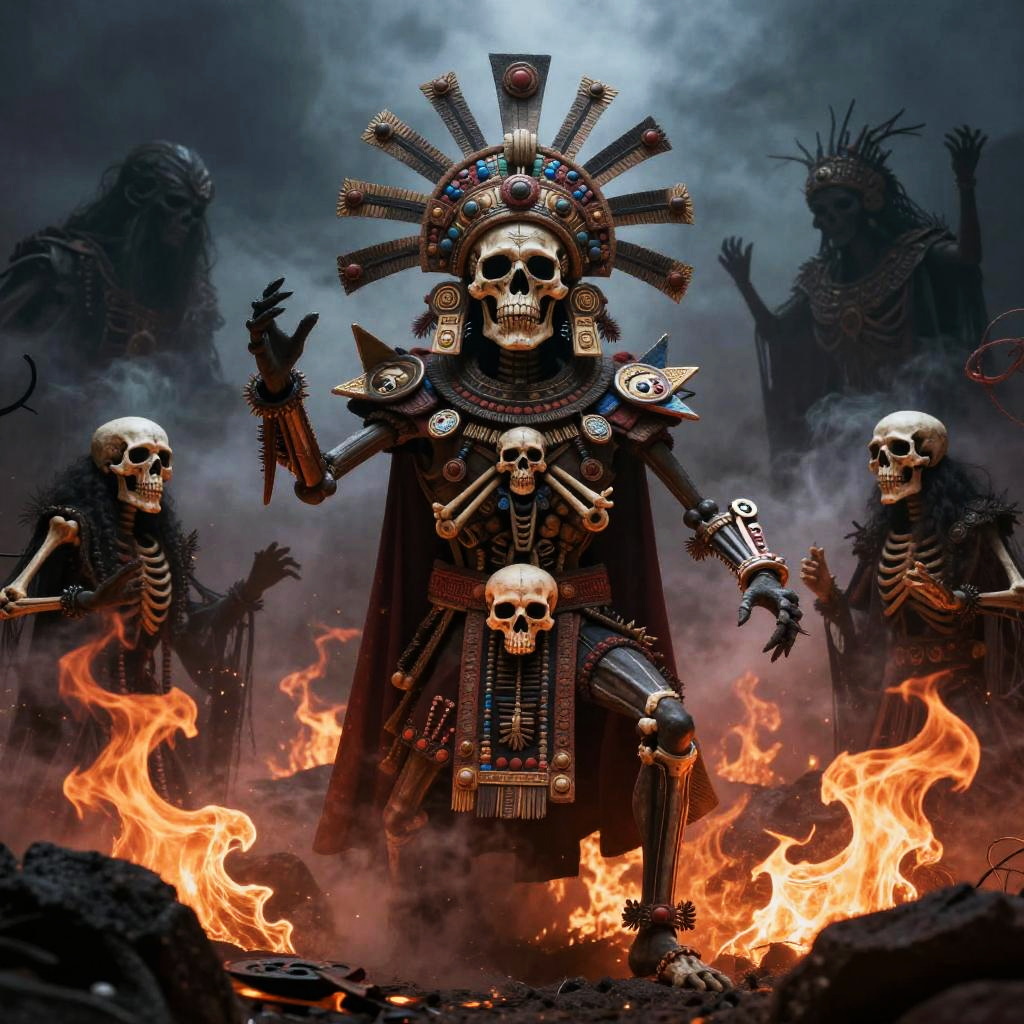 A dramatic portrayal of Mictlāntēcutli, the Aztec lord of death, surrounded by shadowy bones and fiery ethereal spirits, wearing ceremonial garments adorned with skull motifs, set against a foreboding volcanic background with swirling mist.