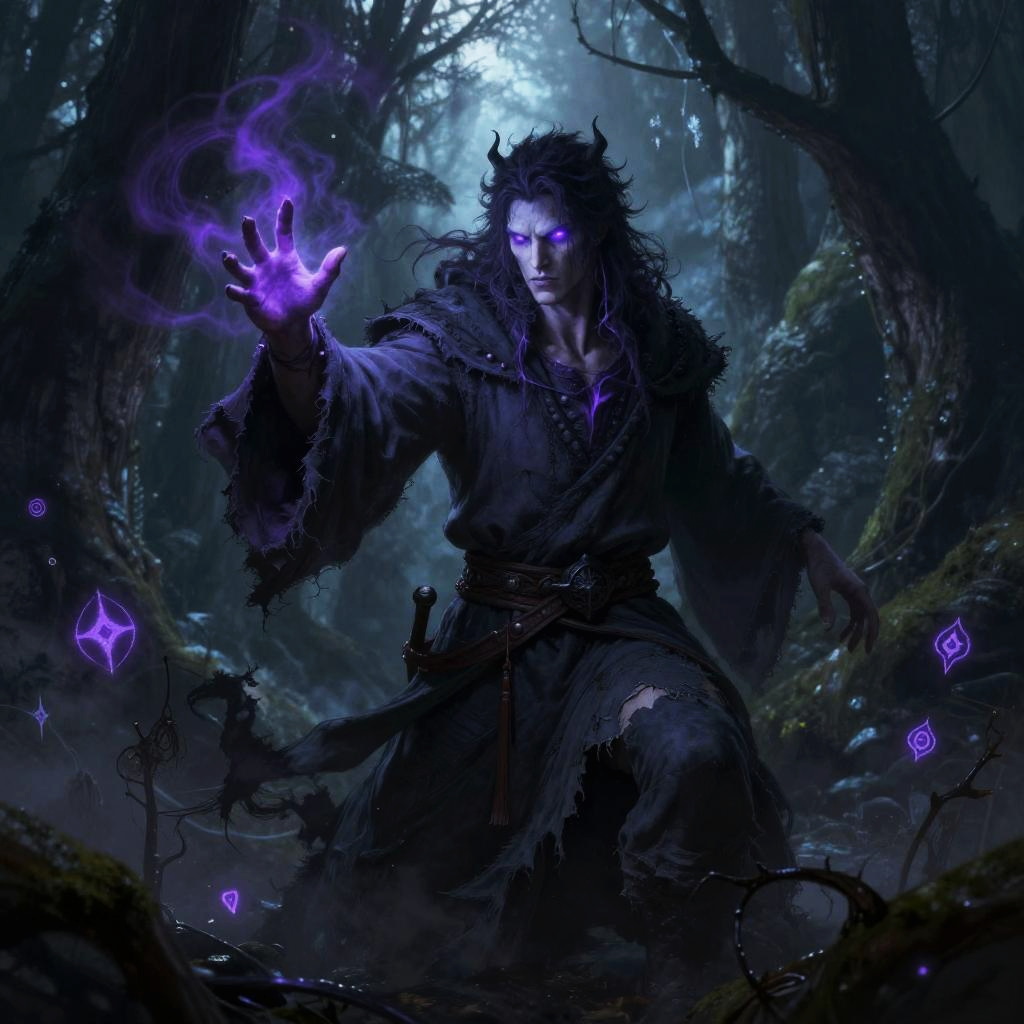 Shadar-kai male mage casting a shadow spell in a dark enchanted forest, his eyes glowing purple as tendrils of shadow magic swirl around him, dressed in torn dark grey robes, eerie glowing symbols floating nearby, atmospheric and mystical fantasy digital painting.