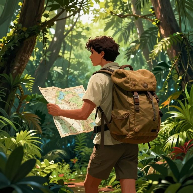 Bekine as an adventurous explorer trekking through a dense jungle with vibrant flora and fauna, carrying a detailed map and vintage backpack, sunlight filtering through the canopy, realistic illustration with rich textures and colors