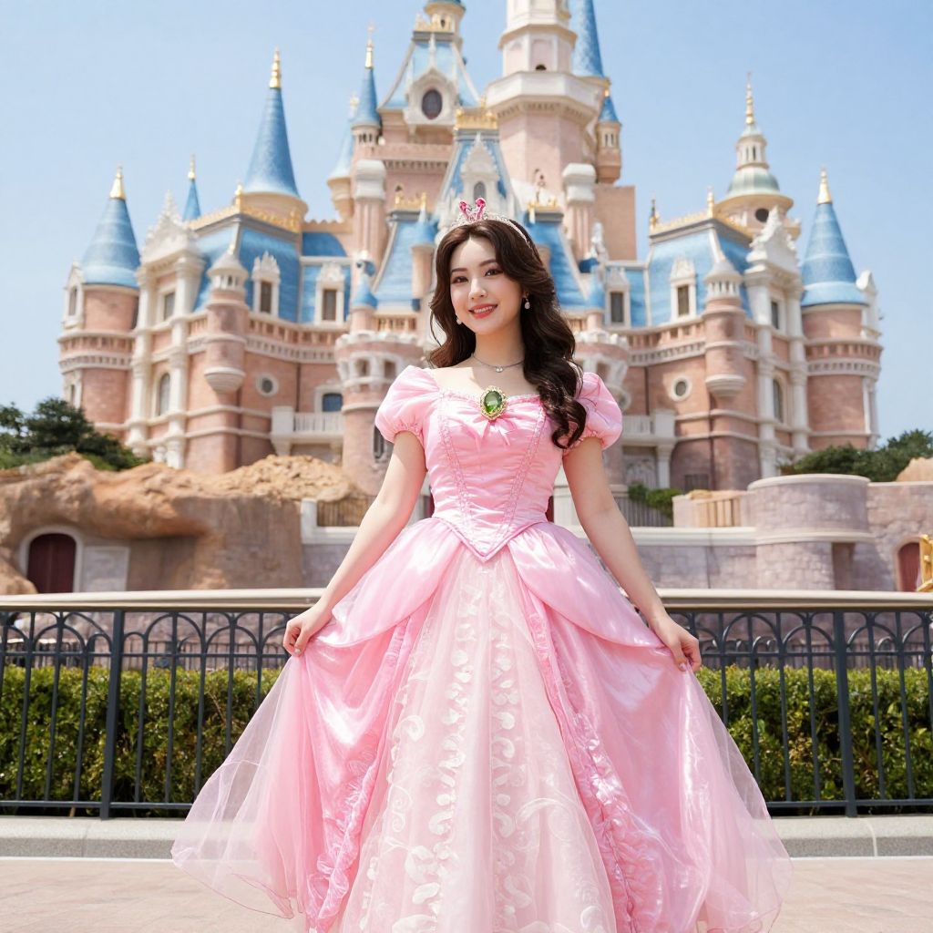 Pink Princess Dress Disney, a woman in a pink dress standing in front of a castle
