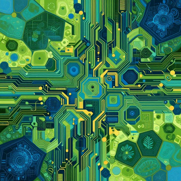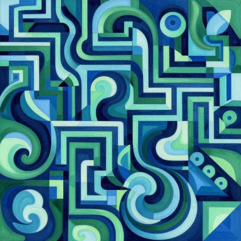 A captivating abstract scene showcases a harmonious blend of organic shapes and geometric precision, reminiscent of Escher-inspired art. From an aerial viewpoint, intricate tessellations extend infinitely across the canvas, creating a mesmerizing labyrinthine landscape. A palette of vibrant blues and greens intermingle with swirling patterns, evoking both tranquility and bewilderment as one navigates this enigmatic terrain. The interplay of light and shadow imbues each form with dynamic movement and stillness, composing a symphony that captivates the viewer's imagination and reveals the hidden beauty within complex forms and designs.