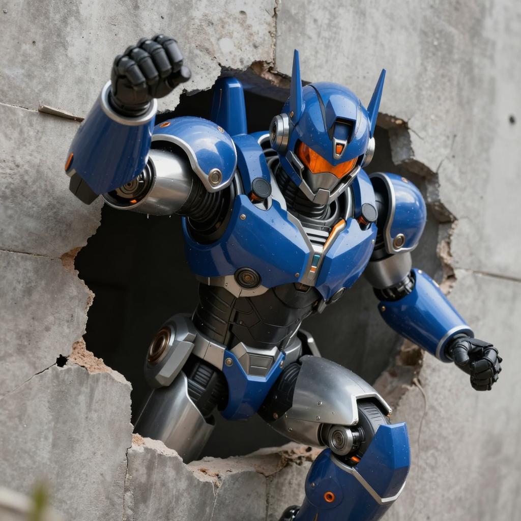 Robotic soldier with shiny blue and silver armor, helmet with orange visor, and black gloves, bursting through cracked, gray concrete wall. The robot's right arm is raised, showing clenched fist. Intense, focused expression visible through visor.