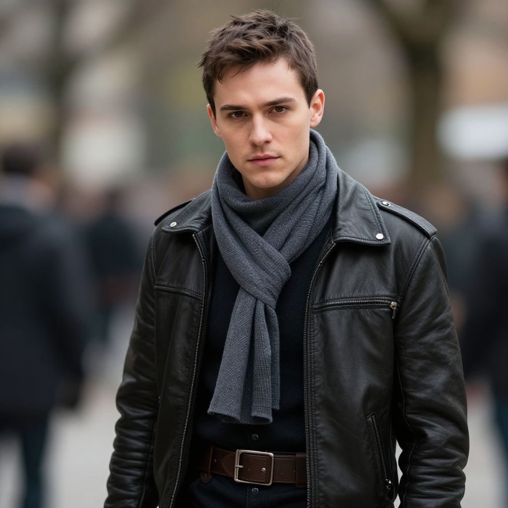 Photograph of a young, handsome Caucasian man with styled brown hair, wearing a dark brown suit, white shirt, and striped navy tie, standing confidently