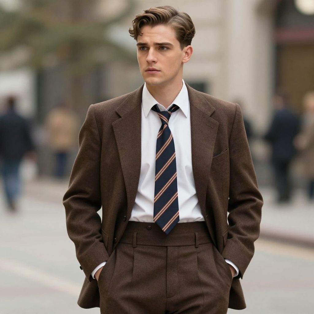 A confident young man dressed in a vintage-inspired brown suit with a white shirt and striped necktie stands outdoors with his hands in his pockets. The style evokes the classic Great Gatsby era, capturing a timeless and sophisticated look against a softly blurred urban background.
