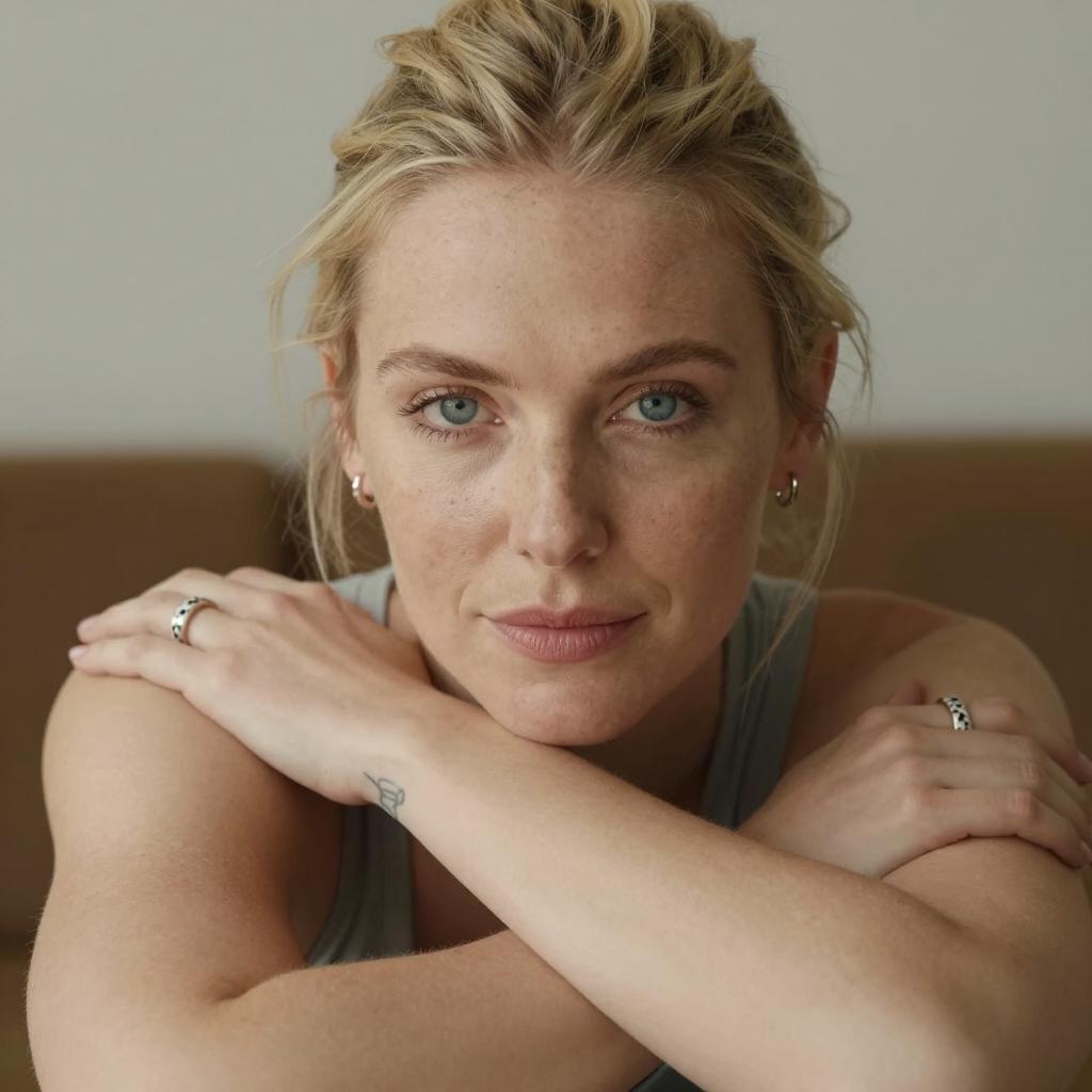 Woman with fair skin and blue eyes, wearing a red shirt and gold necklace, standing near a white wall. Brown hair, slightly messy, pulled back. Painting in background shows three people on beach. Soft light. Face shows slight smile, direct gaze.