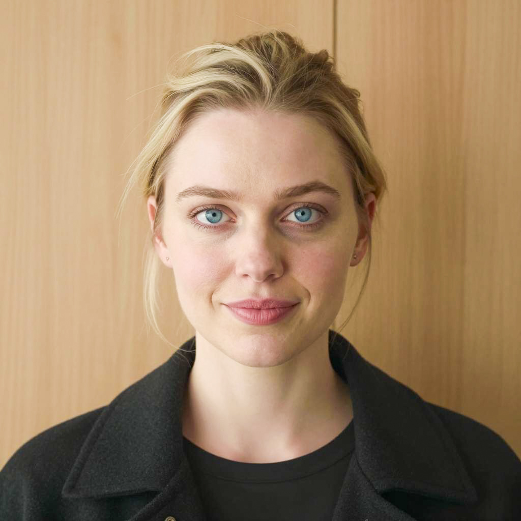 Close-up portrait of a young woman with fair skin, blue eyes, and brown hair styled slightly messy and pulled back. She is wearing a red button-up shirt and a delicate gold necklace with a small pendant. The background features a white wall and a blurred painting of three people on a beach scene. The lighting is soft, highlighting her slight smile and direct gaze.