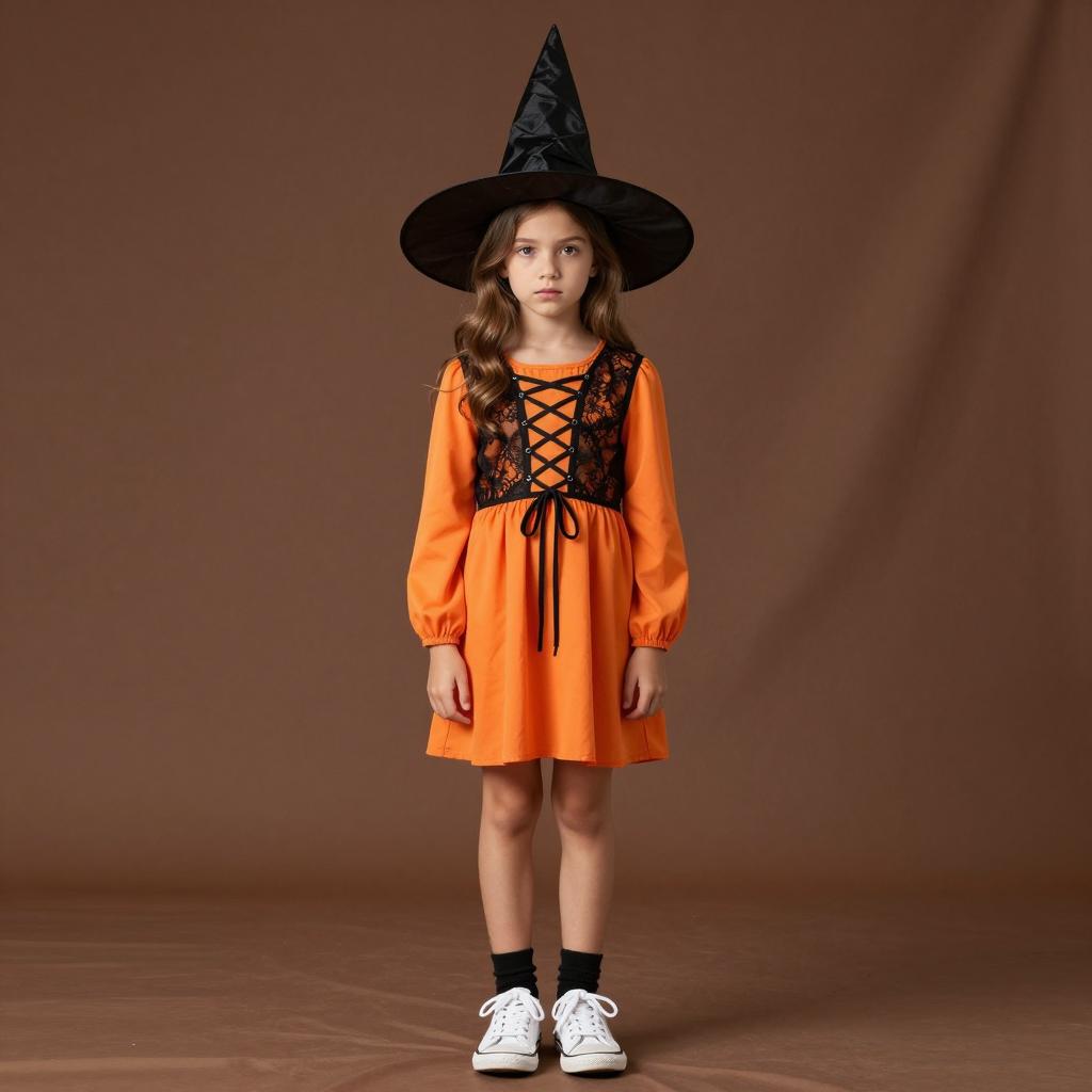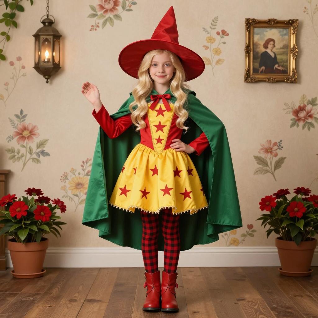 Hocus pocus winifred costume, photorealistic, young girl, wizard costume, red hat with large brim, long wavy blonde hair, green cloak, red corset, yellow dress with red stars, red checkered pants, red boots, standing in front of floral patterned wall, potted plants with red flowers, wooden floor, vintage lantern on left, framed picture on right, fantasy, detailed ures, colorful, whimsical, standing pose, full body shot, daylight, soft shadows