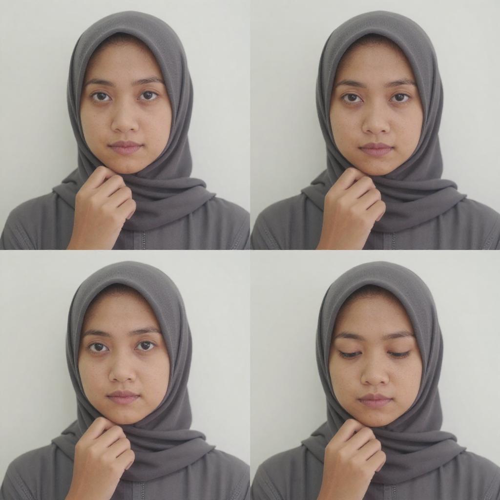 Photograph of an Asian woman with light brown skin and black hair, wearing a dark gray hijab and matching long-sleeve top with subtle ure. She is positioned in four identical close-up shots, with her right hand gently touching her chin, and a neutral expression on her face. The background is a plain, light-colored wall.