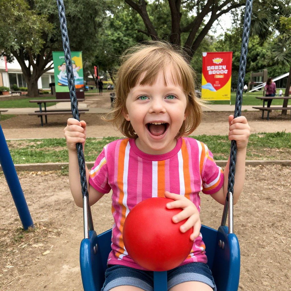 A child with bright green eyes and a round face sits on a colorful playground swing, wearing a pink striped t-shirt with orange and white vertical stripes, laughing and holding a red ball, with a tree-lined park backdrop featuring picnic tables and bright banners.