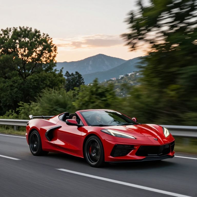 Red 2020 Corvette Stingray Convertible cruising along a scenic road with two passengers inside, framed by lush green trees and distant mountains under a soft sunset sky.