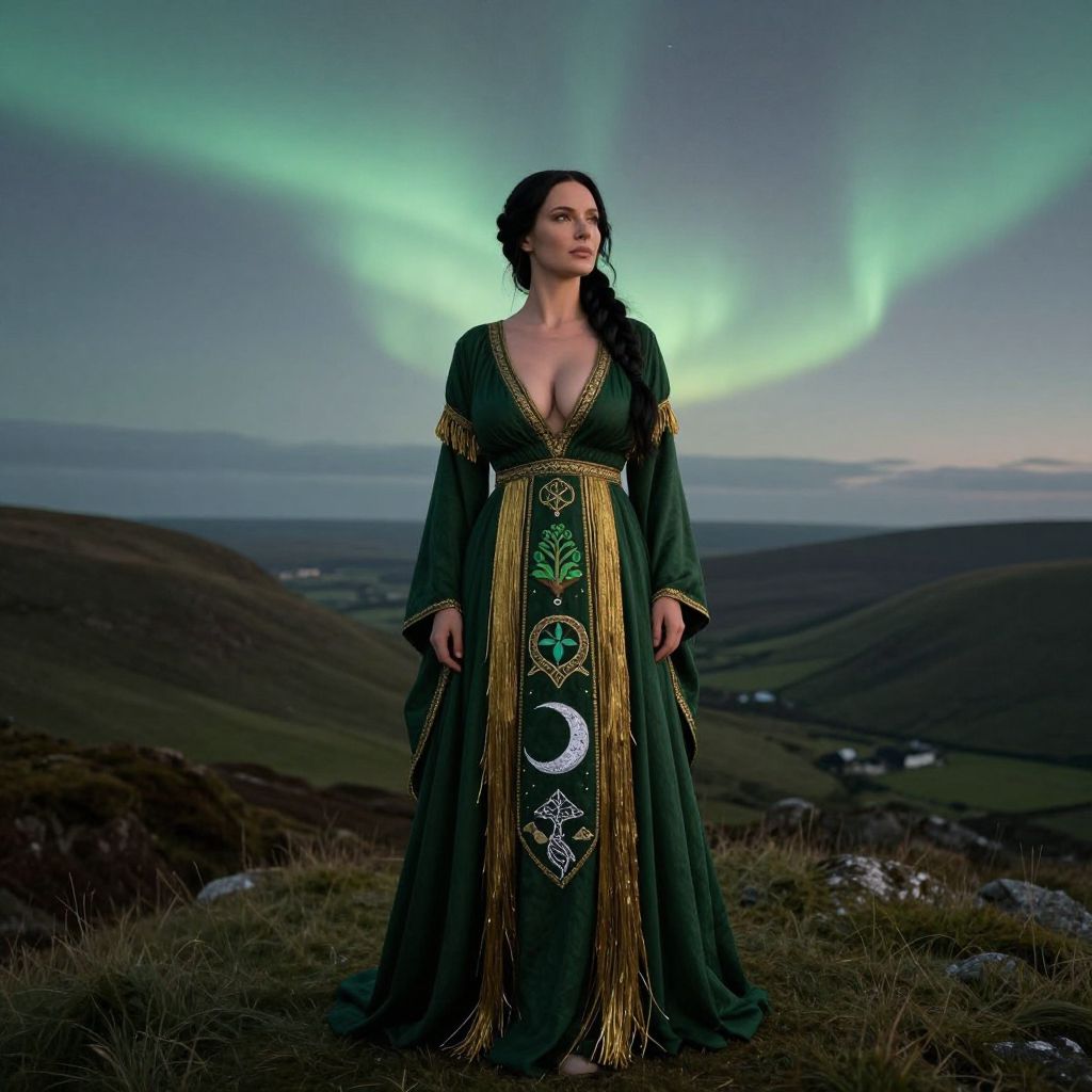 A fantasy-style realistic photo of a woman in a mystical Irish Celtic maiden costume — flowing green dress with golden fringe, embroidered with symbols of the earth and moon, standing atop a hill overlooking a valley under a twilight sky with aurora-like green glows, her face has high cheekbones, fair complexion, dark braided hair, and a serene, mystical gaze, as if she is a guardian of ancient folklore. The woman has big tits and cute face