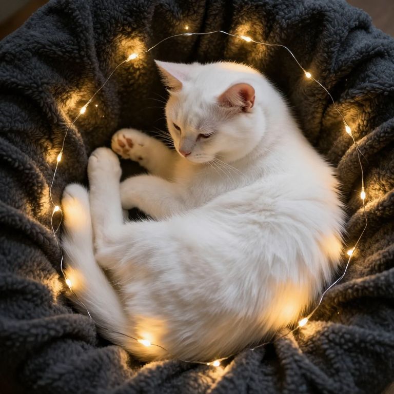 Cuddly white cat curled up in a cozy embrace, surrounded by warm, glowing fairy lights that dance rhythmically against a dark, textured blanket, creating a serene and magical atmosphere.