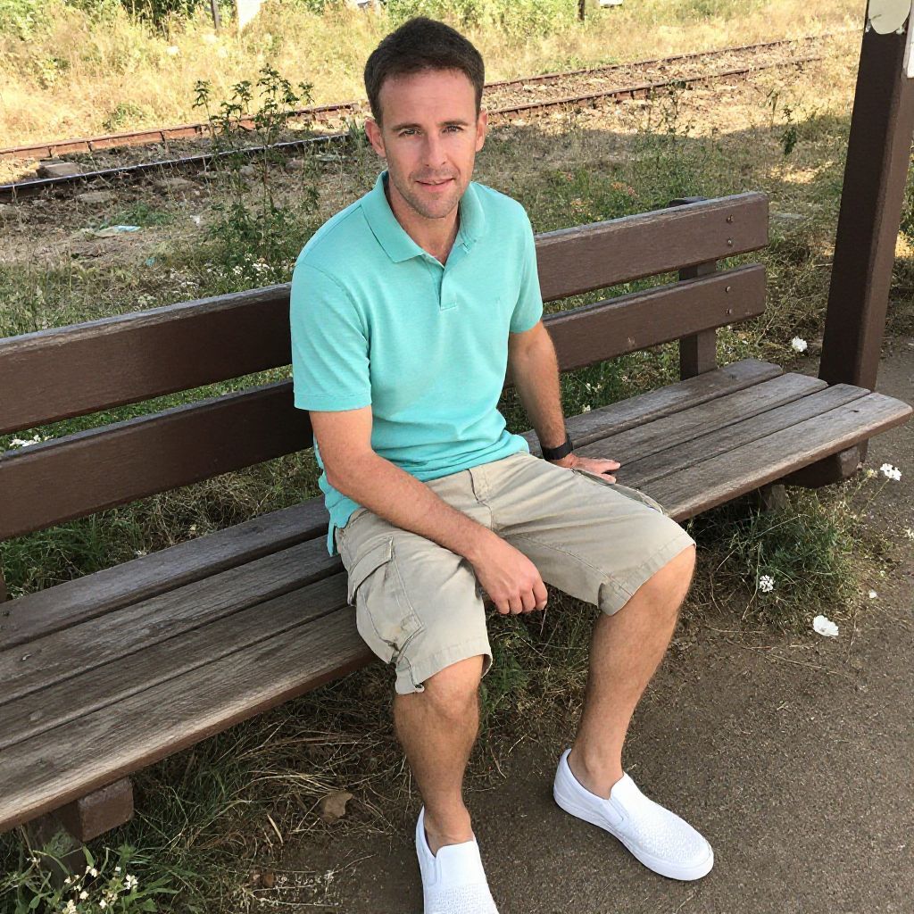 Photograph of a smiling, short-haired man in a light blue polo and beige shorts, sitting on a wooden bench in a sunny, grassy park