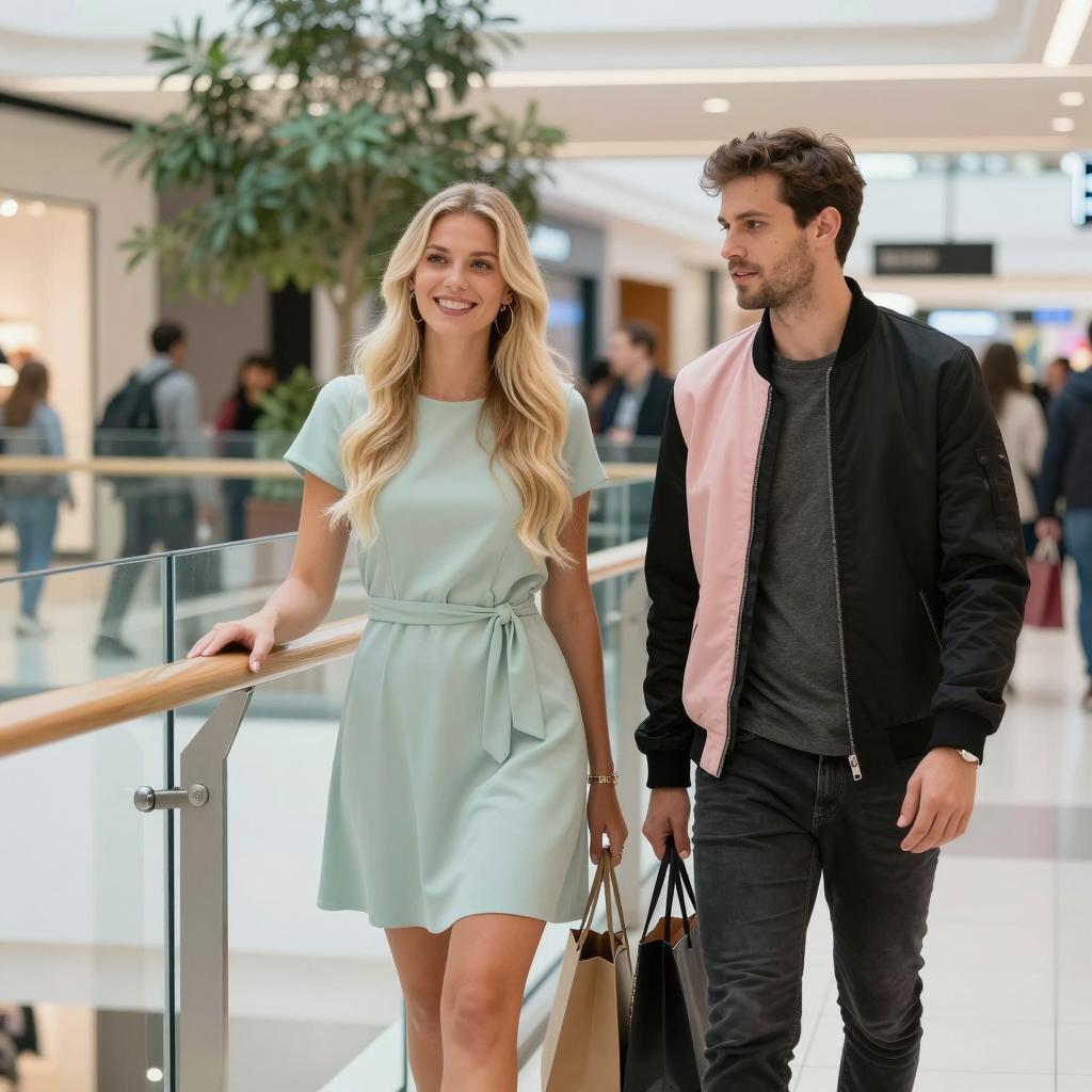 Blonde woman with long hair, wearing a black sweater and white shirt, smiling, holding three shopping bags (blue, red, yellow). Background: blurred street with trees, car, and stop sign. She has a white crossbody bag. Standing slightly turned to the right. Bright, colorful bags contrast with black and white outfit.