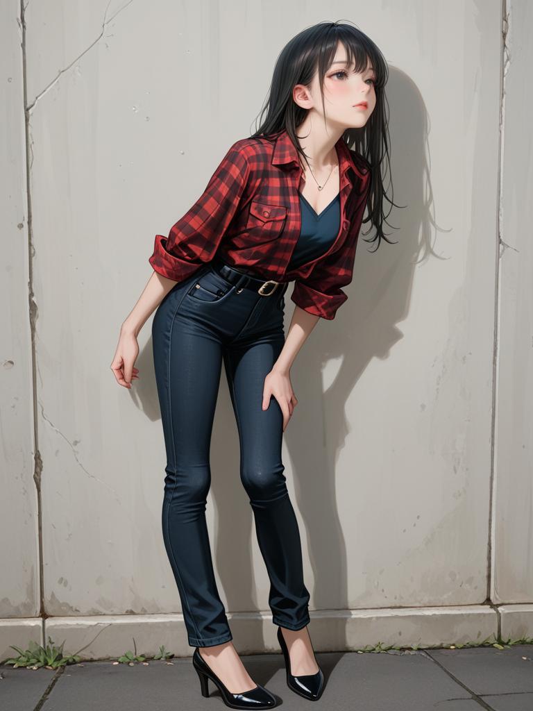 1girl, realistic face, full body shot, Woman, casual, white t-shirt with short sleeves and black lettering across the chest, contrasting black stripes on sleeve hems, longline cut, paired with burgundy leather-like leggings, fitted, short bracelet.