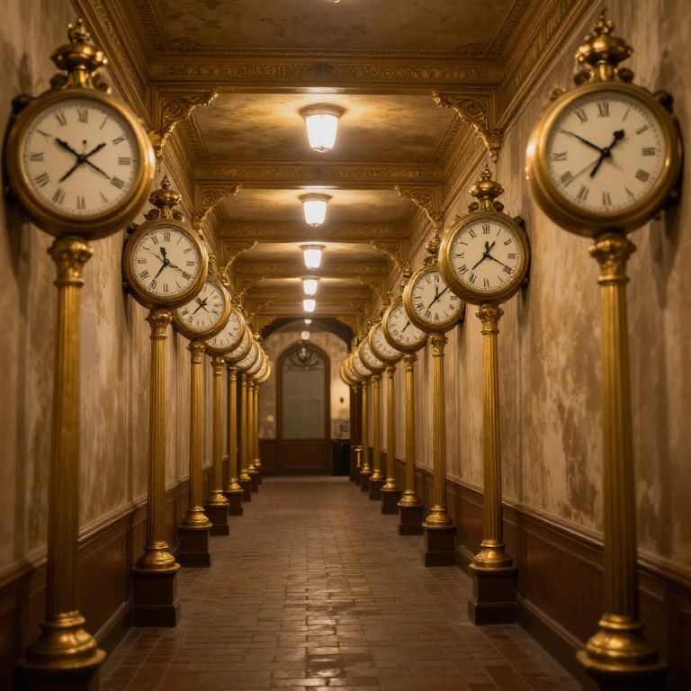 Photograph of a dimly lit, vintage hallway with ornate, gold-colored clock pillars lining both sides. Each clock has a white face with black Roman numerals and black hands, displaying different times. The floor is made of red-brown tiles, and the walls show signs of age with a textured, worn appearance. The ceiling has intricate molding, and two overhead lights cast a warm glow. The perspective creates a vanishing point towards the end of the hallway, where a small, arched window is visible. The overall style is reminiscent of early 20th-century architecture.