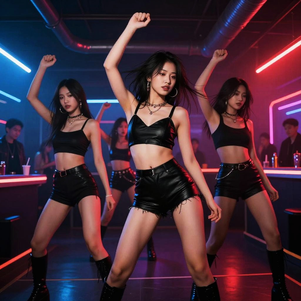 Girls in revealing clothing dancing energetically at a futuristic nightclub, dramatic lighting, bold colors, high energy, cyberpunk aesthetic, digital art