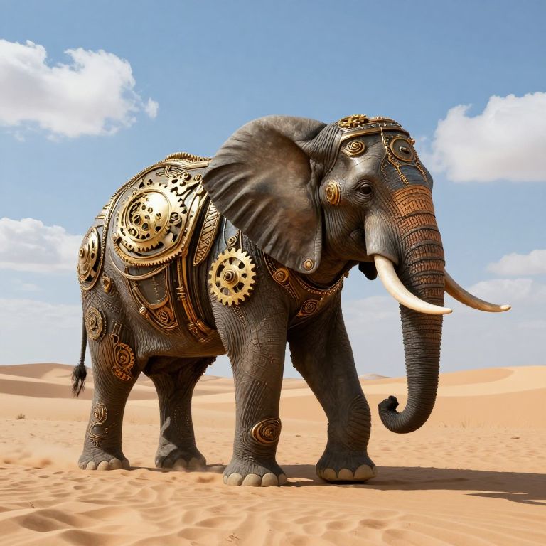 A majestic 3D-rendered elephant adorned with intricate golden gears and mechanical details roams a serene desert landscape, its presence casting subtle ripples across the sandy terrain beneath a clear blue sky dotted with fluffy clouds, evoking a blend of steampunk and fantasy aesthetics.