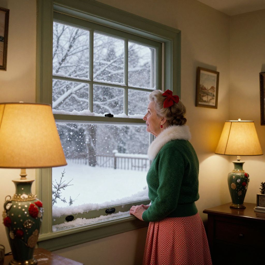 Photograph of an elderly woman with light skin and gray hair, adorned with a red floral hair accessory, standing in a warmly lit room. She wears a green sweater with a white fur collar and a red polka-dot skirt, gazing out a snow-covered window. Two table lamps with beige shades flank the window, casting a soft glow. Snowflakes gently fall outside, visible through the window. The room has beige walls with small framed pictures. A wooden table with a ceramic lamp and red flower vase is in the foreground. The mood is cozy and nostalgic.