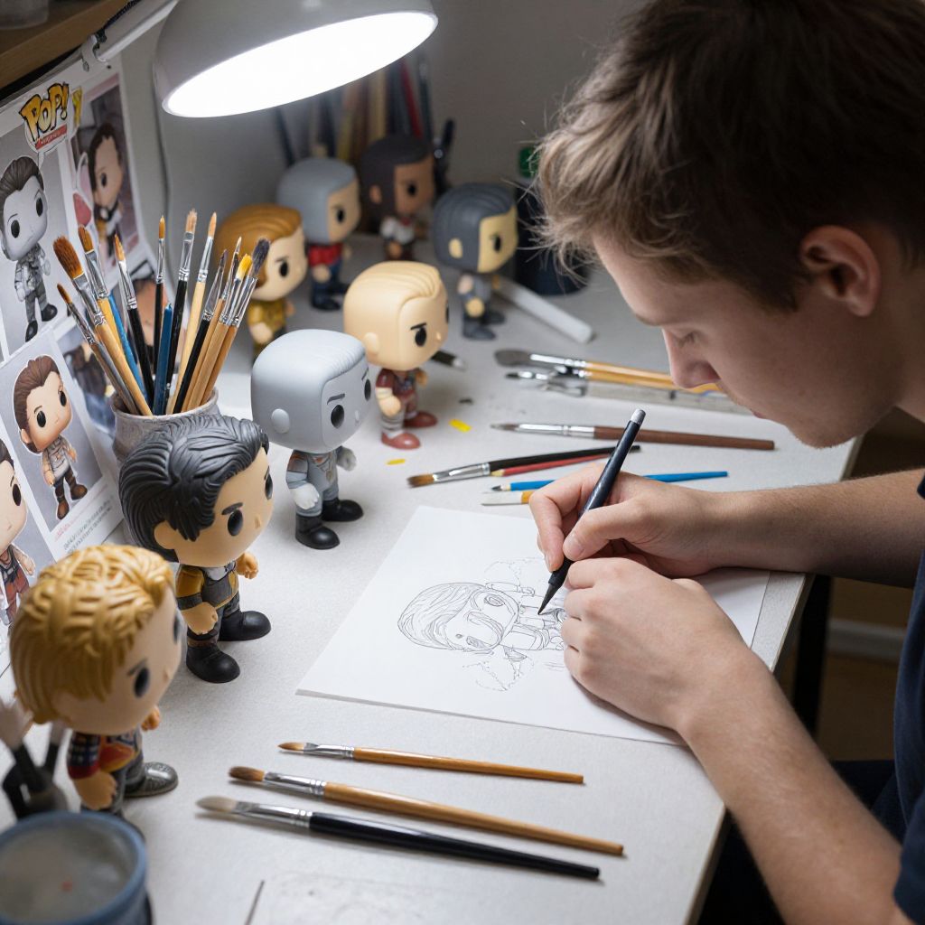 Best custom Funko Pop makers working in artisan workshops, surrounded by paintbrushes, sculpting tools, and reference models, creating personalized vinyl figures, realistic lighting emphasizing the creative process and intricate custom details.