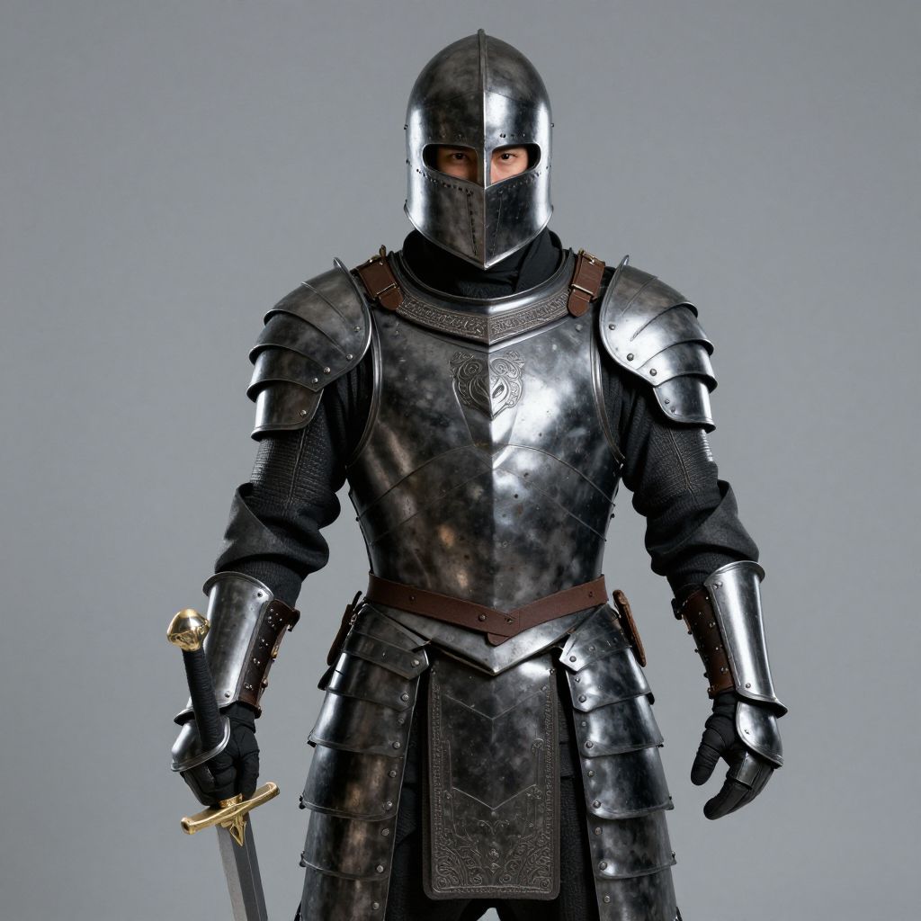 Photograph of a medieval knight in full black plate armor with a glossy, reflective finish. The knight wears a matching black helmet with a narrow visor revealing only the eyes. The armor includes intricately detailed shoulder plates, chest plate, and gauntlets, with a brown leather belt around the waist. The knight holds a slender sword with a gold hilt in the right hand. The background is a plain, light gray, emphasizing the knight's dark, shiny armor. The texture of the armor appears smooth and polished, contrasting with the matte black of the helmet and gloves.