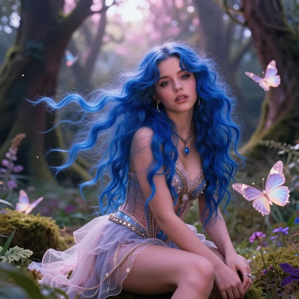 Photograph of a young woman with long, vibrant blue wavy hair wearing a pink crop top with ruffles and a multi-colored ruffled skirt in pastel hues. She stands in a whimsical, pastel-colored bakery with ornate chandeliers, pink and cream walls, and shelves filled with cupcakes, cakes, and candy. The bakery has an antique, fairy-tale-like decor with soft lighting. Her makeup is bold with dark eyeliner and pink lipstick, and she wears a delicate necklace and bracelet. The background is slightly blurred, focusing attention on the woman in the foreground.