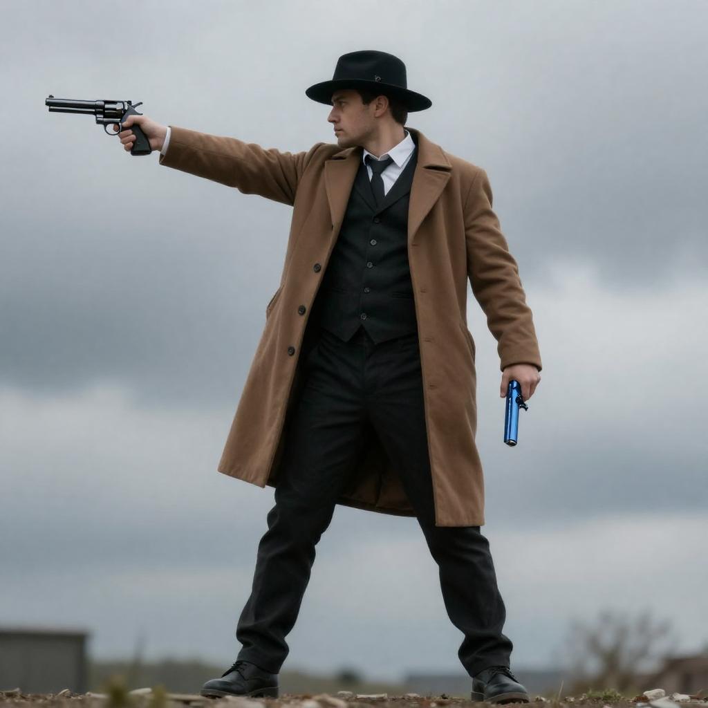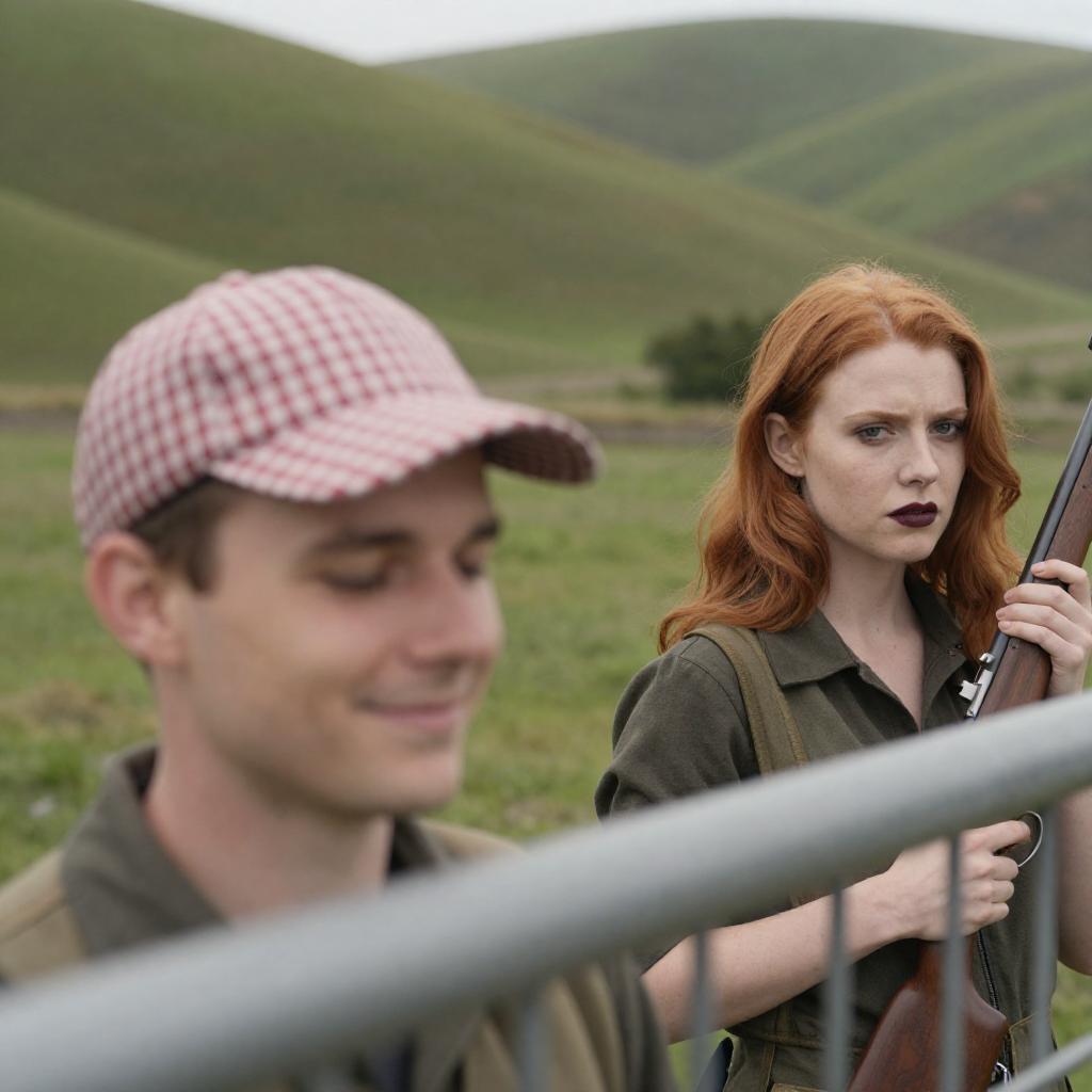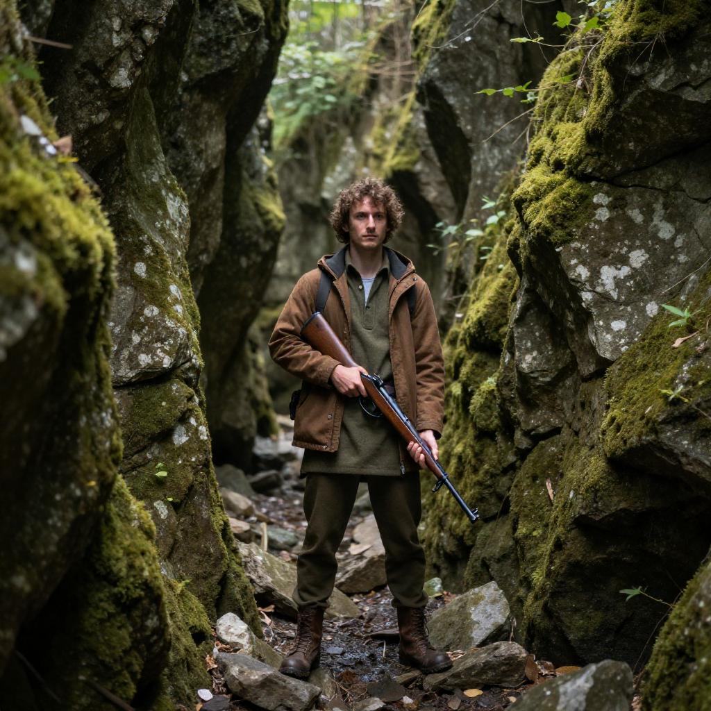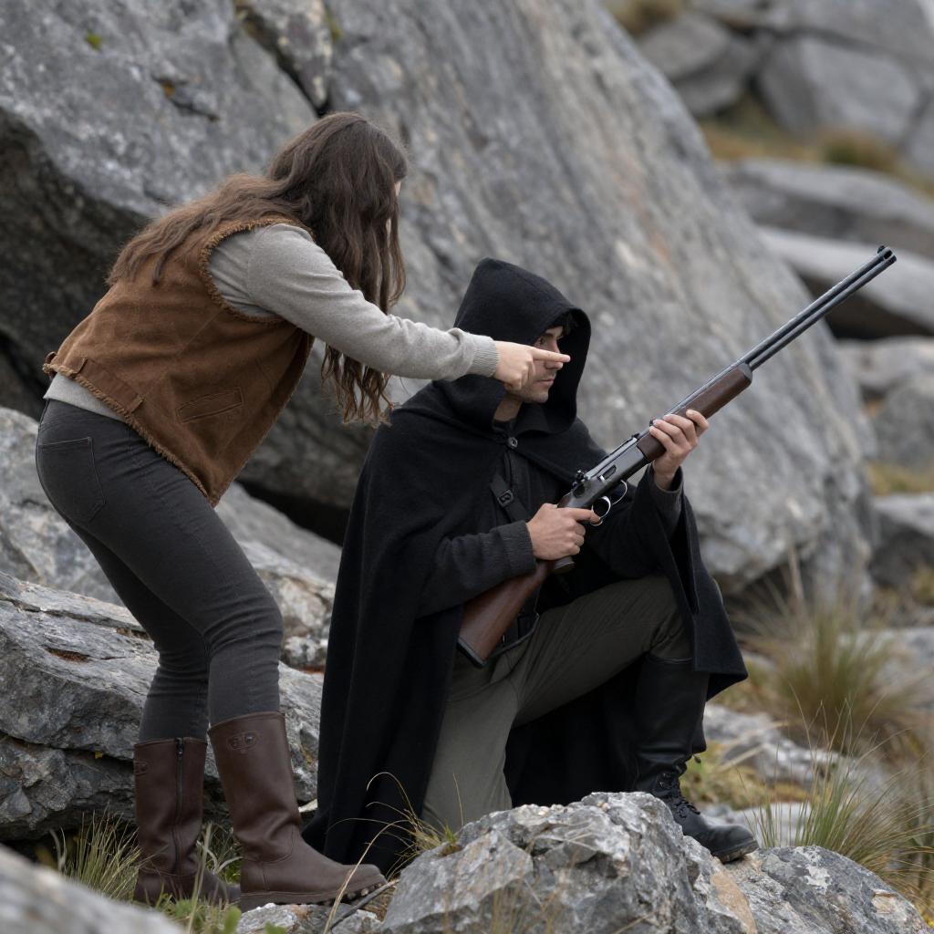 Photograph of two people in a rocky, mountainous setting. One with long brown hair, brown vest, and boots, leans forward, pointing. The other, in a black hooded cloak, holds a long gun, looking intently. Large rocks and grass surround them.