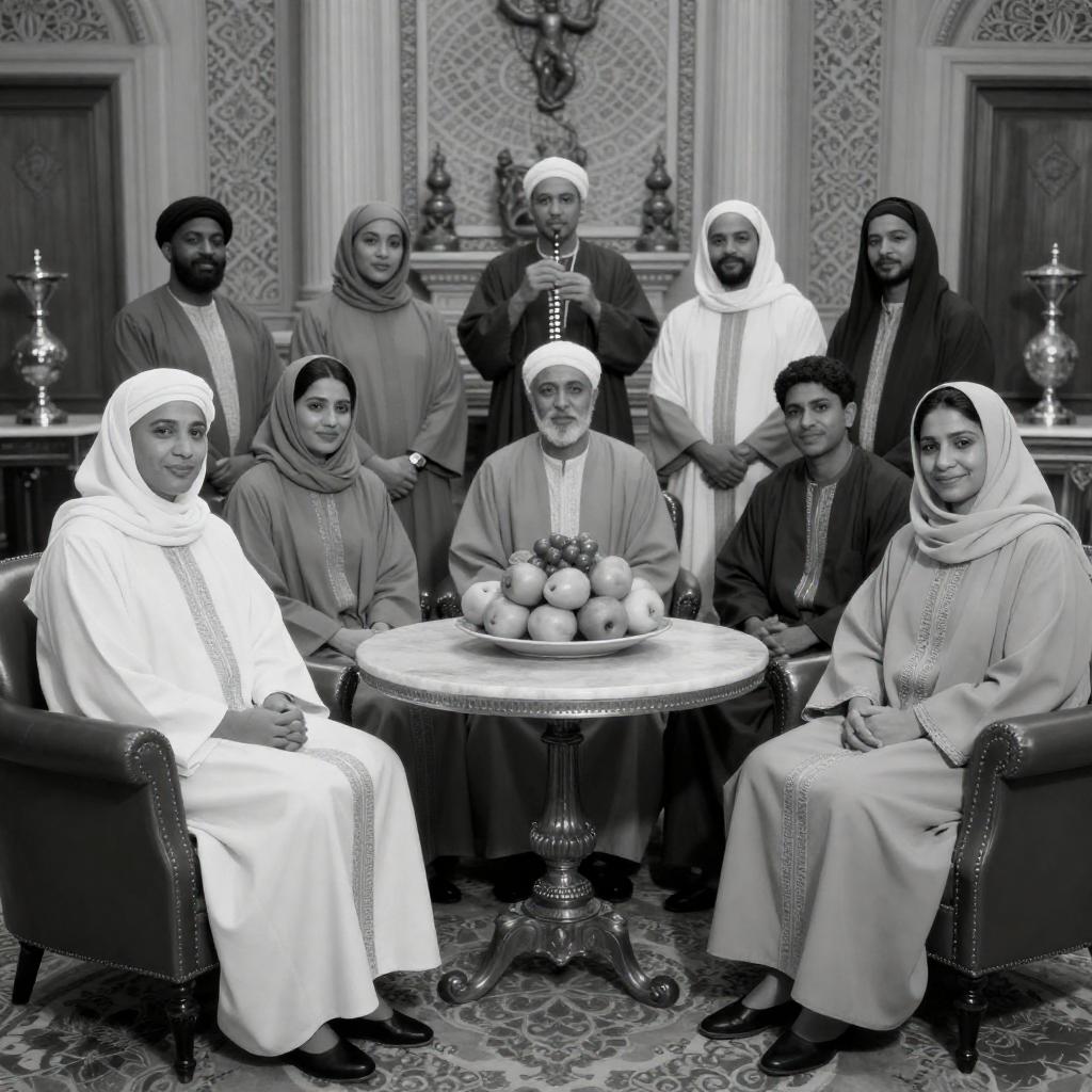 Black and white photograph of a group of eleven people in elaborate robes and headscarves, seated and standing in an opulent, patterned room. Center: round table with a large fruit arrangement. People: various ages, some smiling, others neutral. Background: ornate walls, columns, and sculptures. One person stands in the background, playing a small instrument. Leather armchairs in the foreground.