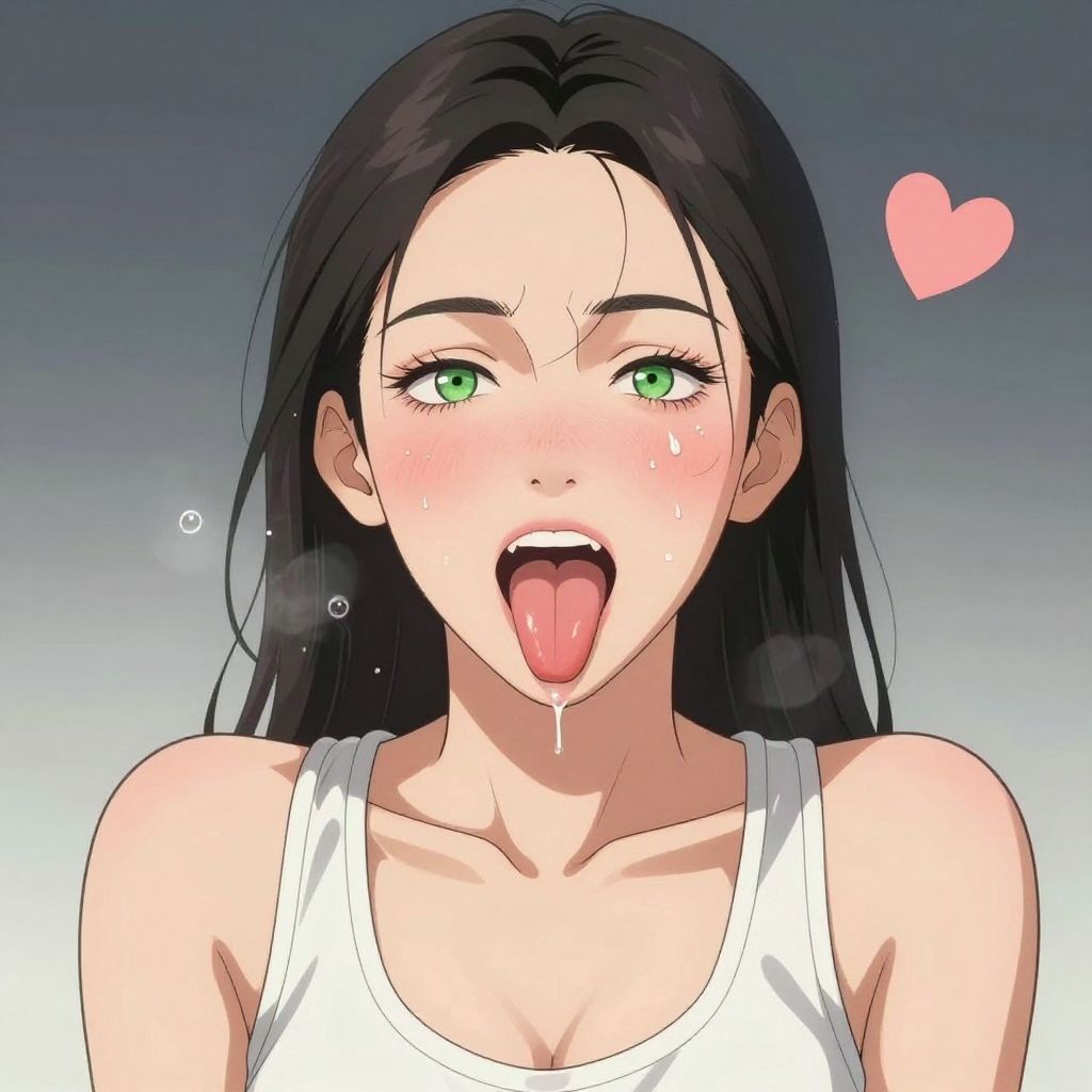 (best quality:1.2), 1girl, (full-face blush:1.2), (rolling eyes:1.2), (heart:1.2) (saliva:1.2), (sweat:1.2), (cum:1.2), upper body, green eyes, gradient background, open mouth, tongue out, (steam:1), (trembling:1.1), stray pubic hair, v arms, tank top, cum bubble, fang, constricted pupils, wide eyed
